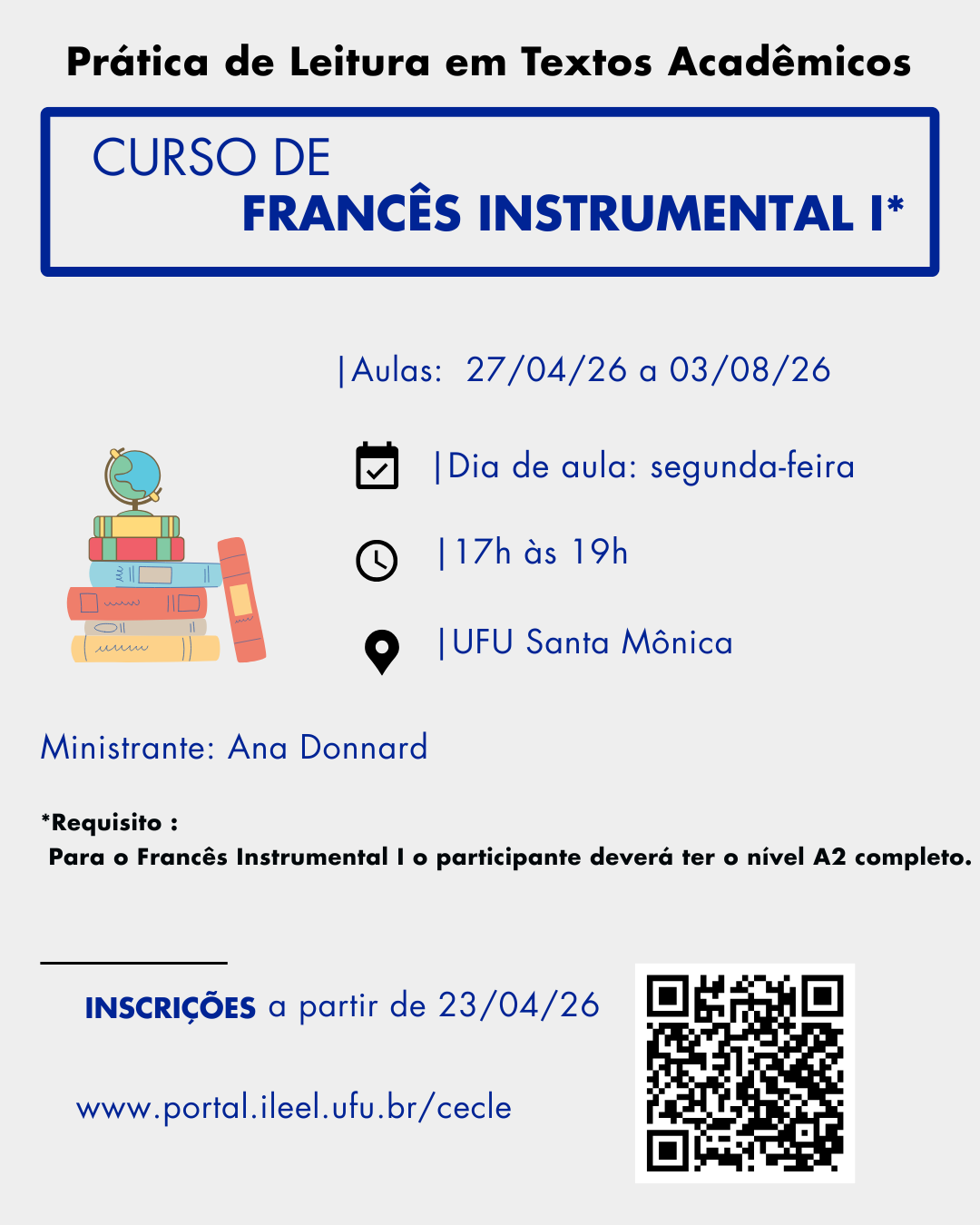 AconteceCurso de Francês Instrumental IInscrições abertas! por LeticiaPublicado: 23/04/2026 - 15:53Última modificação: 23/04/2026 - 15:59 Compartilhe no FacebookTweet Widget Whatsapp Whatsapp Google Plus One CLIQUE AQUI E FAÇA SUA INSCRIÇÃO.