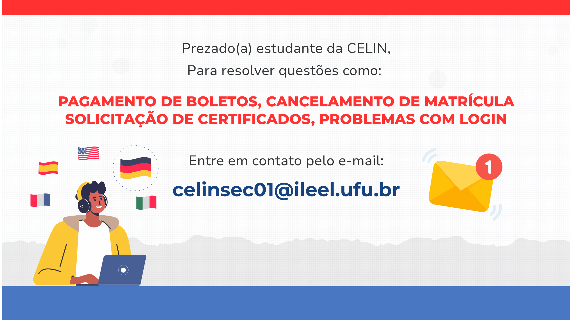 Dúvidas com relação a pagamento de boletos, cancelamento de matrícula, solicitação de certificados, ... podem ser encaminhadas para o e-mail da secretaria da CELIN: