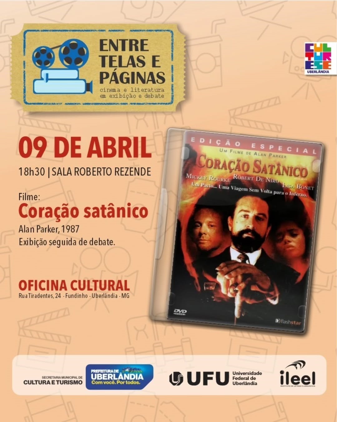 Encontro 1 (09/04/2026 – 18:30): CORAÇÃO SATÂNICO (1987). DIREÇÃO: Alan Parker. ESTRELANDO: Robert De Niro, Mickey Rourke, Lisa Bonet, Charlotte Rampling. Exibição seguida de debate.