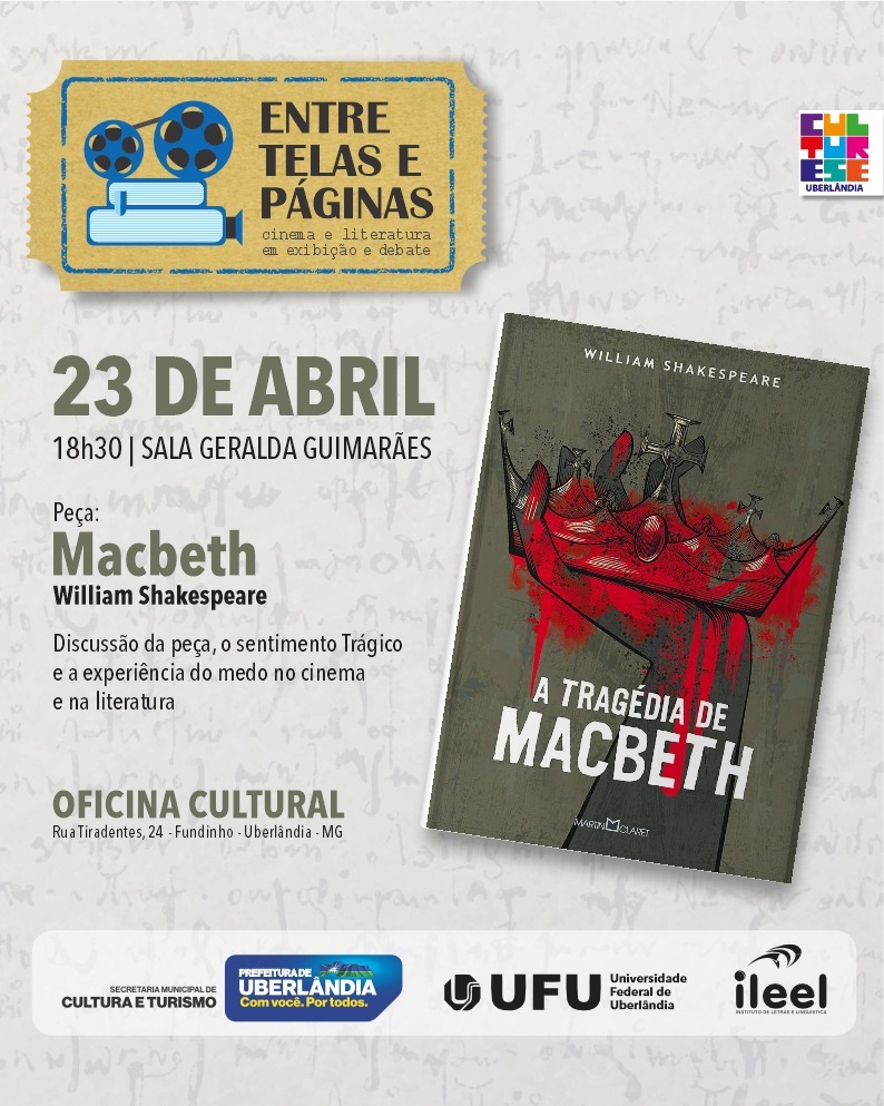 Encontro 2 (23/04/2026 – 18:30): A TRAGÉDIA DE MACBETH (1611[?]), de William Shakespeare. Tradução sugerida de Lawrence Flores Pereira (2025). Debate em torno do e sentimento Trágico e a experiência do Medo no texto de Shakespeare e no filme de Alan Parker.