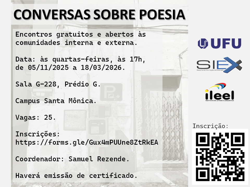AconteceConversas sobre poesiaData: 05/11/2025 by LeticiaPublished: 03/11/2025 - 18:04Last modification: 03/11/2025 - 18:06 Compartilhe no FacebookTweet Widget Whatsapp Whatsapp Google Plus One FORMA DE INSCRIÇÃO: Até 05/11/2025, pelo link: https://forms.gle/Gux4mPUUne8ZtRkEA