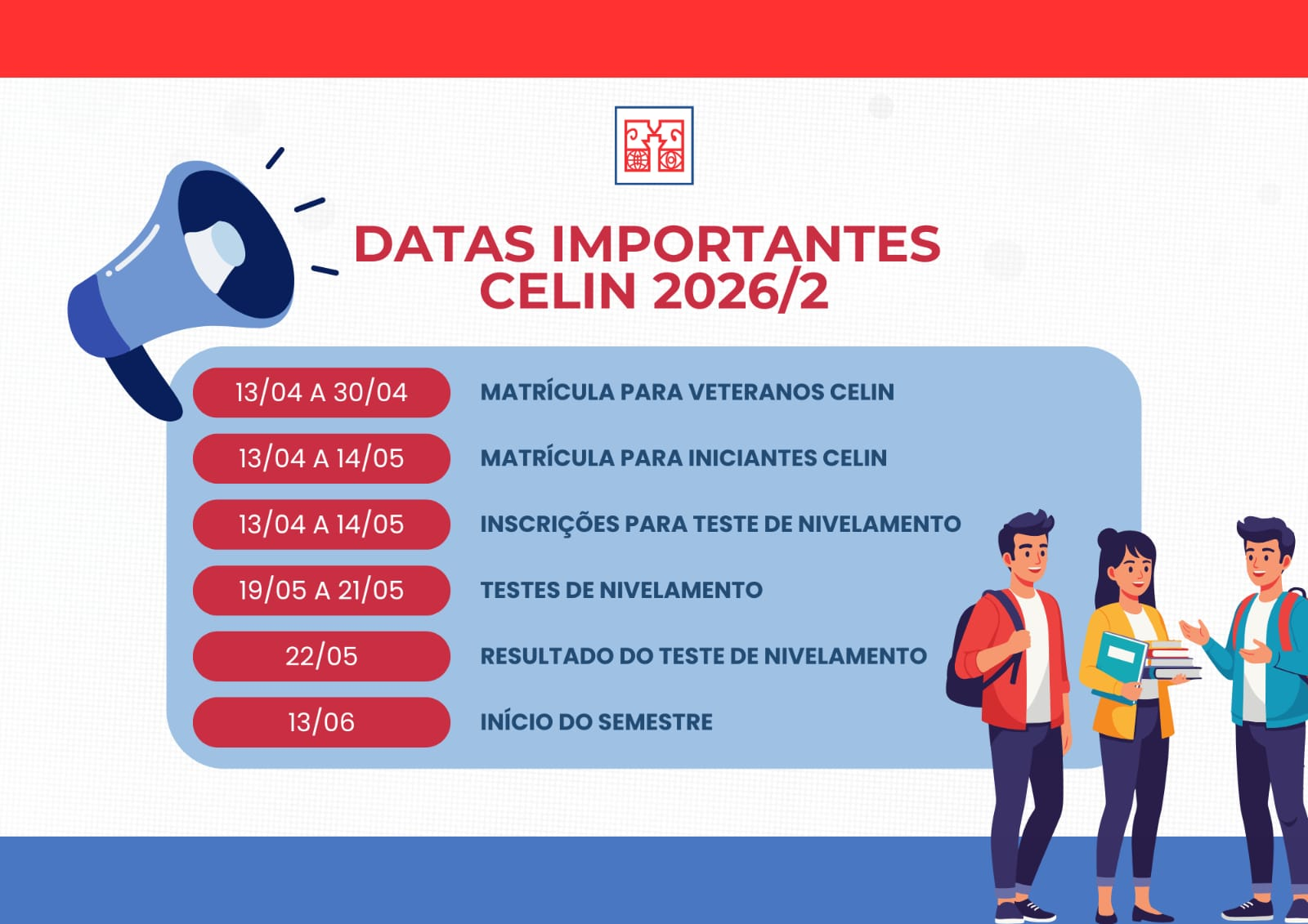 AconteceCronograma de Matrículas 2026/2 by CELINPublished: 11/02/2026 - 17:47Last modification: 13/02/2026 - 17:39 Compartilhe no FacebookTweet Widget Whatsapp Whatsapp Google Plus One Confira nosso Calendário letivo para 2026/2!