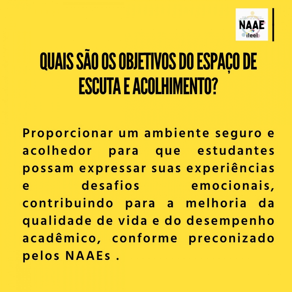 Espaço de Escuta e Acolhimento - Rodas de conversa de uma hora e meia, fundamentadas na escuta acolhedora, com mediadores/mediadoras supervisionados/as por psicólogos/ psicólogas. O objetivo é de proporcionar um ambiente seguro e acolhedor para que estudantes possam expressar suas experiências e desafios emocionais, contribuindo para atenuar o sofrimento mental no espaço acadêmico. Os encontros acontecem em datas pré-definidas, divulgadas pelas coordenações dos cursos e na página do ILEEL.